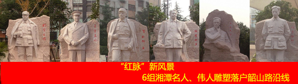 双拥路、建设路、韶山路是湘潭市“三纵两横”主干道的重要组成部分。前文提到的《朝》和《滴》分别是位于双拥路的双拥广场以及建设路的雨湖广场内,而韶山路则以红叶李、紫薇等红花、红叶植物来突出红色主题,并分别以“独臂上将—— 彭绍辉”、“牧童将军——卢冬生”、“借重偏师——黄公略”、“起义先驱——罗亦农”、“百战神威——陈赓”、“秉笔名将——谭政”这6位湘潭籍革命军事家为背景题材的雕塑来渲染湘潭的红色文化。